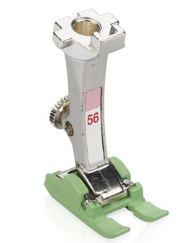 Open embroidery foot with sliding sole #56 is suitable for appliqués, Richelieu embroidery, or following patterns on “sticky” fabrics.