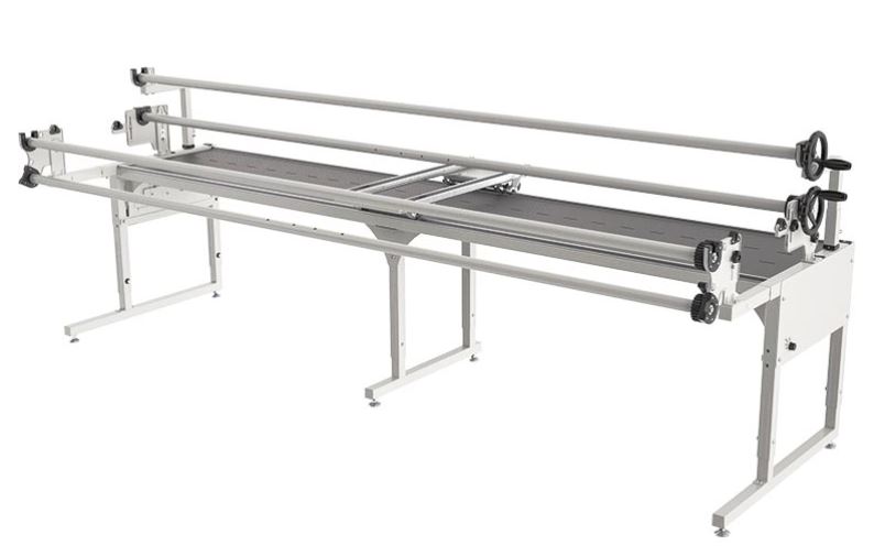 The Grace Company's Quilting Frame, the Continuum II, is a professional-grade quilting frame designed to make quilting easier, more precise, and more enjoyable. This frame is designed to fit all Q'nique mid and long arm machines as well as standard home sewing machines and can be used for both hand and machine quilting. The Continuum II is made with a durable, heavy-duty steel frame that provides excellent stability and support for your quilting projects. It features a height-adjustable design that allows you to customize the frame to your specific quilting needs, whether you're working on a small or large quilt. The Continuum II has smooth gliding rails that make it easy to move your quilt back and forth as you work on it. These rails are designed to reduce friction and prevent any tugging or pulling on your fabric, allowing you to achieve precise, even stitches with ease. Additionally, the Continuum II features a three rail system that enables you to easily install and adjust your fabric layers. This system includes a set of bungee clamps that securely hold your fabric edges in place, ensuring that it remains taut and smooth throughout the quilting process and Grace cloth leaders to allow stitching right to the edges. Finally, the Continuum II has available optional accessories, including a ruler base, laser light, and stylus which, when fitted to the Grace Q'nique machines can be used to create accurate and precise designs on your quilting projects.